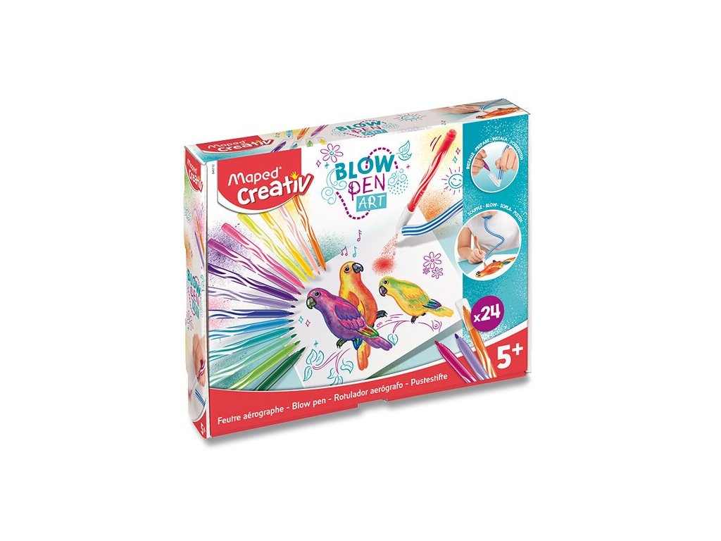 Sada Maped Creativ Blowpen Art obsahuje 2 nástavce pro foukání, 24 barevných fixů, 5 čistých listů formátu A5. Flexibilní nástavec umožňuje volnost pohybu při kreslení.Vhodné pro děti od 5 let.