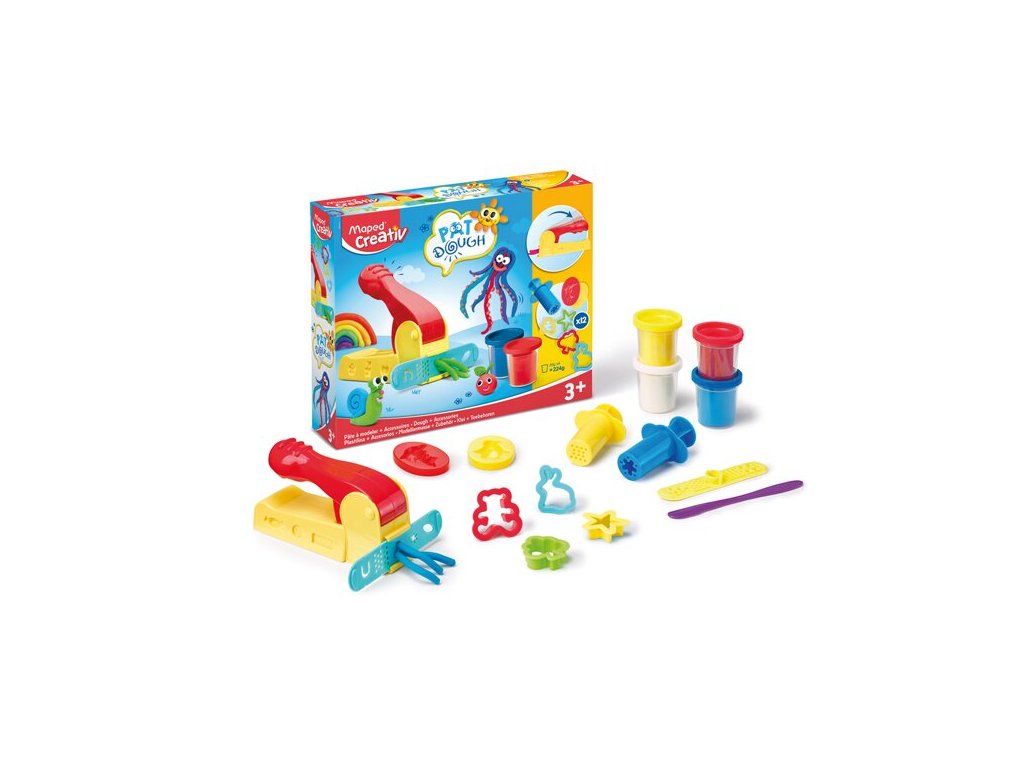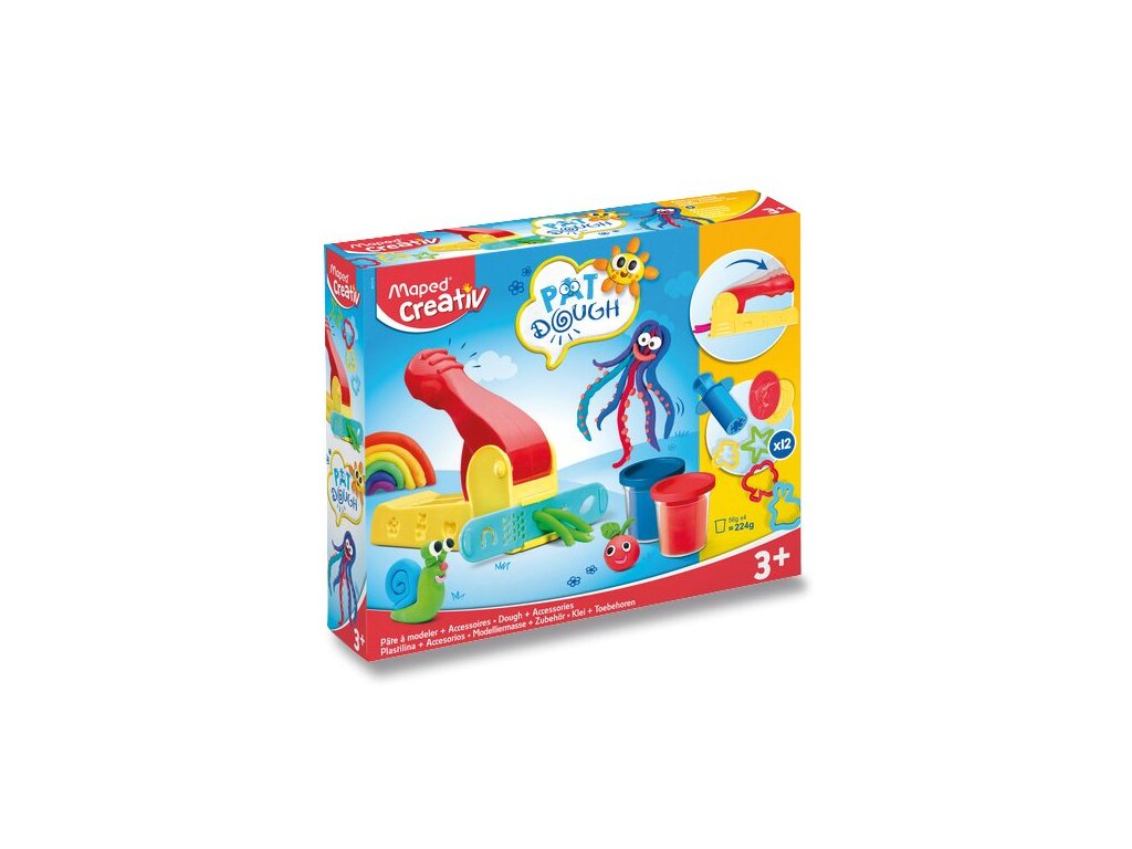 Dětská kreativní sada Maped Creativ Modeling Pat´Dough na modelování pomocí tvarovací formy. Sada obsahuje tvarovací formu, modelovací hmotu ve 4 základních barvách v plastové nádobce, plastový nožík, 2 pravítka na tvarování, 4 vykrajovátka, 2 zdobičky, 2 formičky se zvířecím motivem.Vhodné pro děti od 3 let.