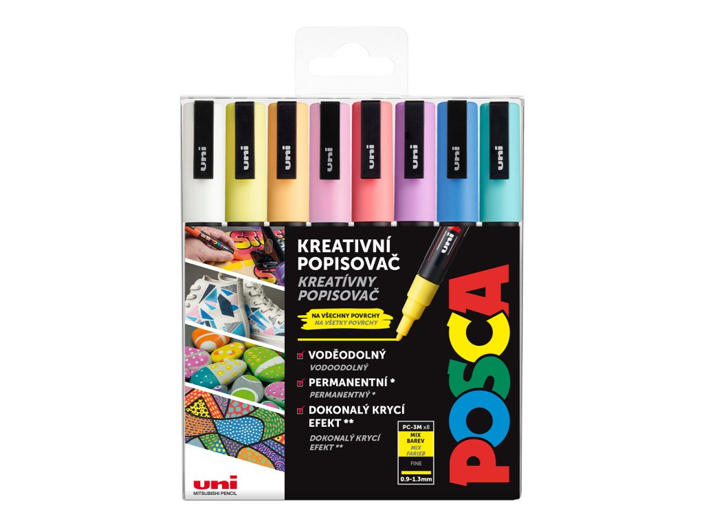 Zakulacený, ale stále jemný hrot se dokáže přizpůsobit jakémukoliv tahu a poskytuje maximální volnost při tvorbě. Je ideální pro každého uživatele, od umělců a profesionálů, kteří jej používají k přidávání barev a stínování ve svých projektech, přes příznivce kreativních koníčků jako je scrapbooking, popisovávání fotografií a kresba na kamínky až po skejťáky, kteří si zdobí svá prkna, trička a bundy.Sada obsahuje 8 kusů popisovačů PC-3M v pastelových barvách.
