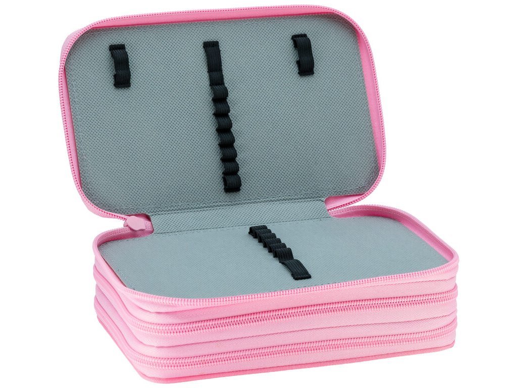 Třípatrové penály pojmou nejvíce psacích a školních potřeb.První patro obsahuje 8 gumiček na pastelky, 2 gumičky na tužky a jednu větší na pero, gumičky ořezávátko i gumu a malou uzavíratelnou kapsičku na drobnosti.