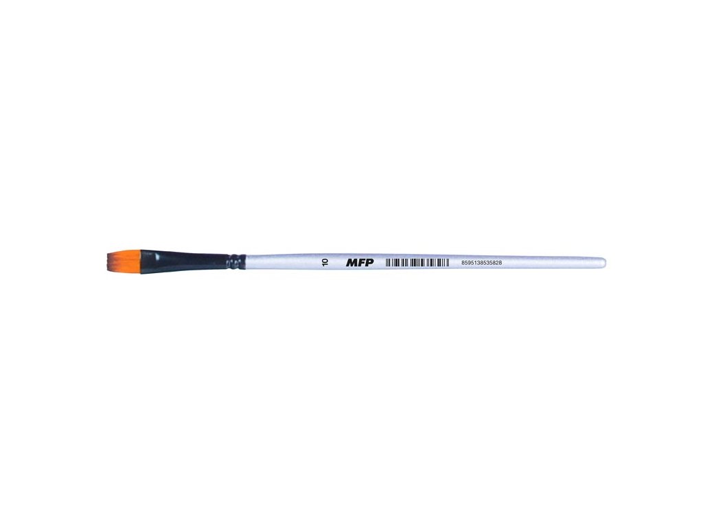 Štětec plochý s jemným syntetickým vlasem a dřevěnou rukojetí. Díky syntetickým vláknům usnadňuje roztírání barev. Vlákno je elastické a vyniká vysokými absorpčními schopnostmi. Je méně náchylný k poškození barvami a ředidly než štětec přírodní. Je také výrazně odolnjěší proti poškození či lámaní. Snadno se udržuje v čistotě, a proto vykazuje delší životnost. Hodí se jak pro školní využití, tak i pro různé malířské techniky a povrchy. Ideální pro malování větších ploch nebo stínování. Lze s ním malovat na plocho nebo hranou tenké linky. Určený pro hutnější barvy, kde je důležitá pevnost a odolnost.Velikost: 10