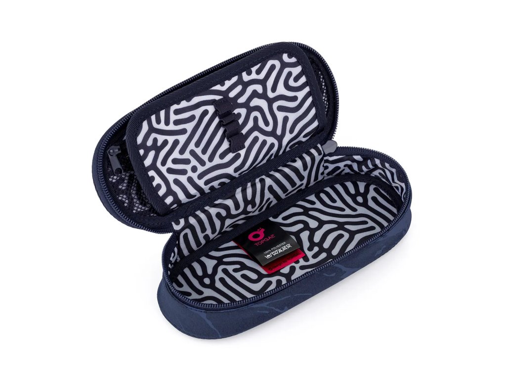 Polstrované pouzdro pro studenty i školáky.Oválný penál pro všechny starší školáky a studenty. Uvnitř pouzdra je síťová kapsička na zip a klopa s devíti gumičkami na propisky. Volný prostor pod klopou slouží pro další psací potřeby – pastelky, fixy, ale i pravítko nebo kružítko.