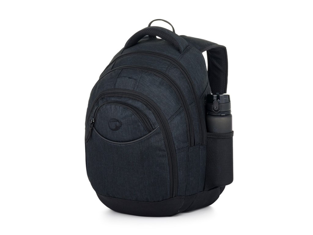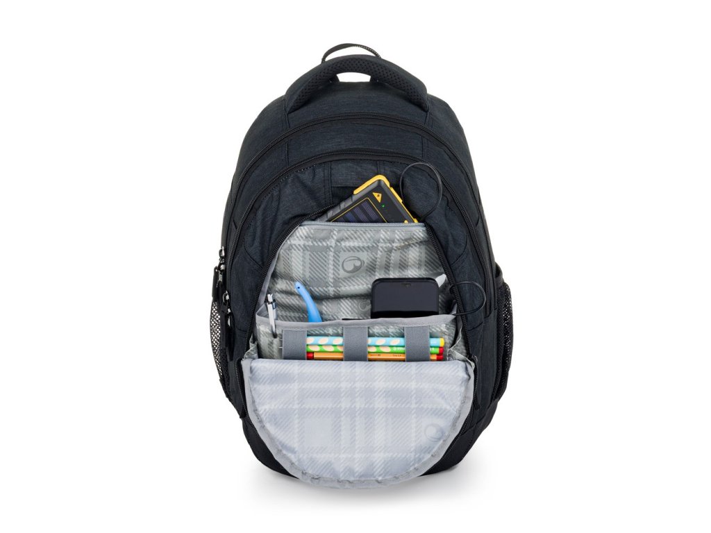 Má tři hlavní komory a přední prostornou kapsičku (hlubokou 23 cm) na školní čipy, jízdenky a další věci, které je potřeba mít po ruce.