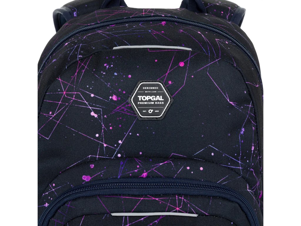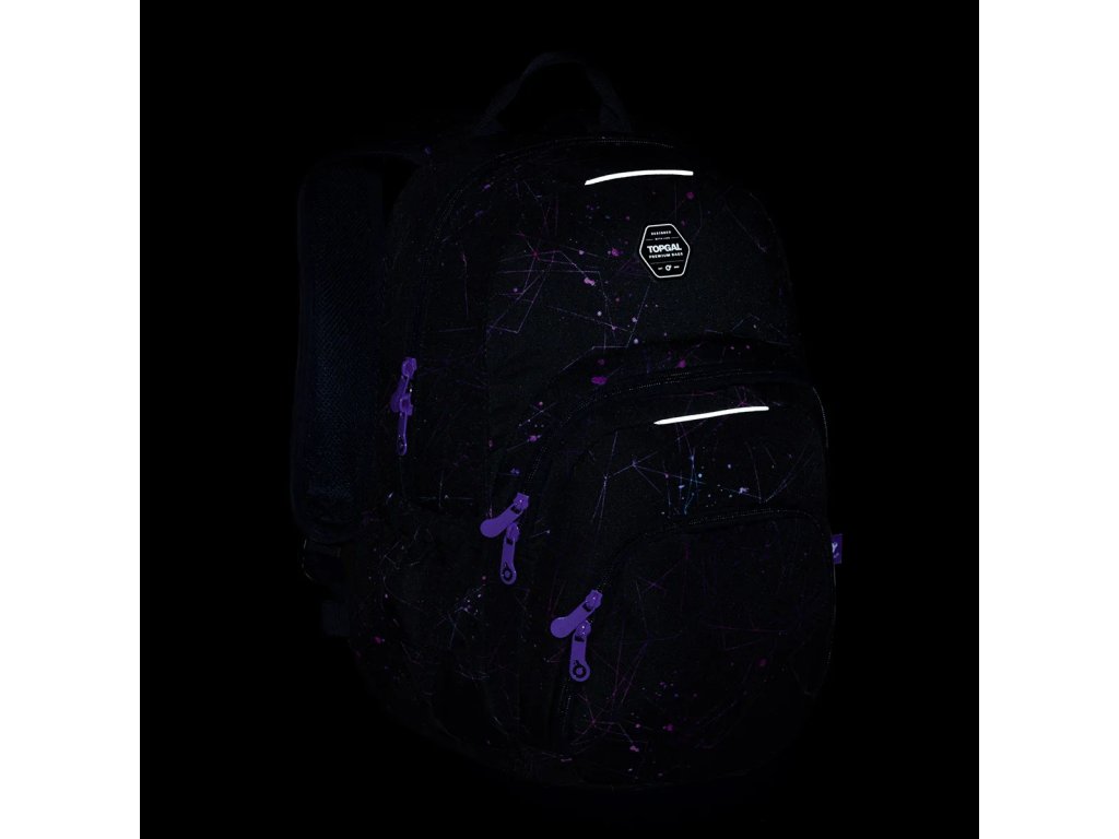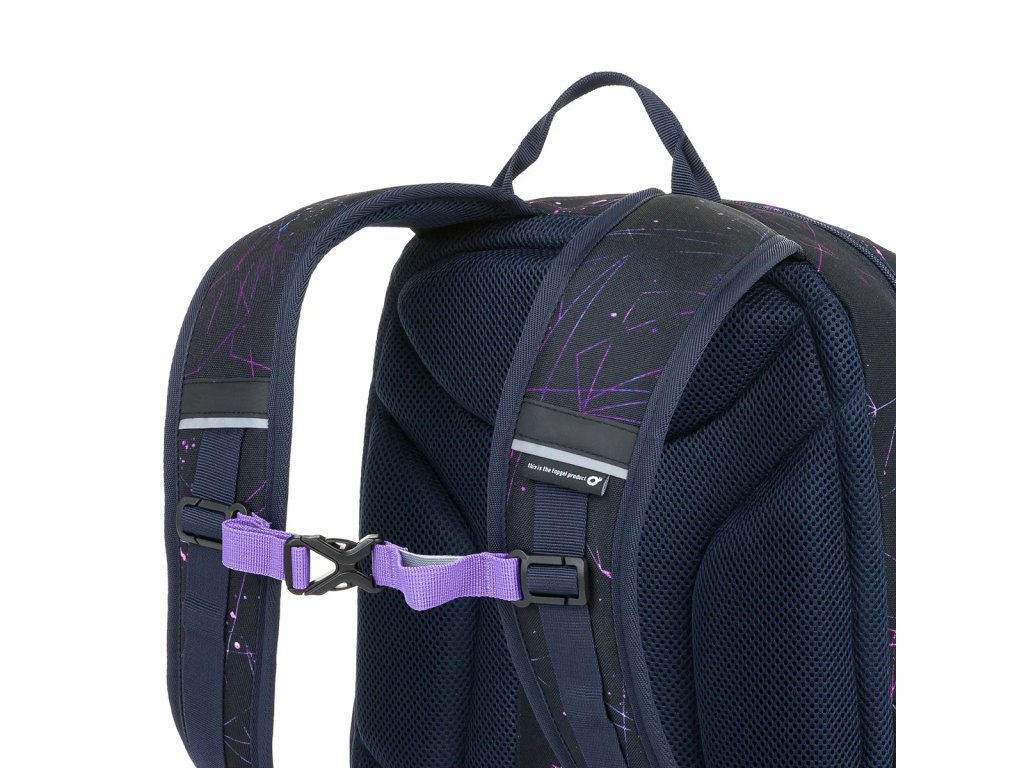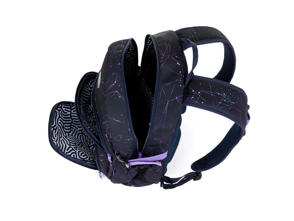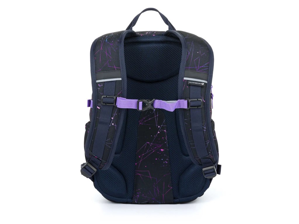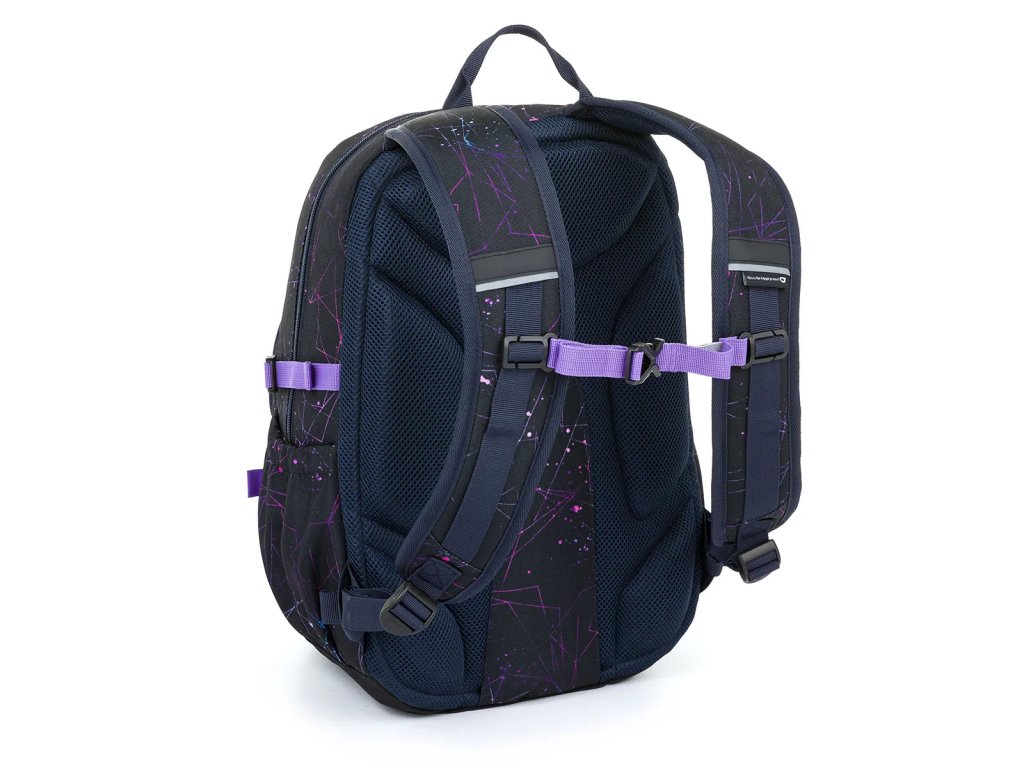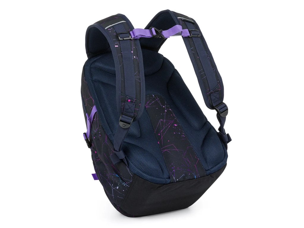 Objemný studentský batoh se díky černému základu hodí ke každému oblečení. Padne na záda všem slečnám s výškou od 145 cm.Jednokomorový batoh s fialovými detaily nepokazí žádný outfit. Záda batohu jsou polstrovaná, anatomicky tvarovaná a pevná díky lehké hliníkové výztuze. Uvnitř zadní komory je umístěna polstrovaná kapsa na notebook i tablet.