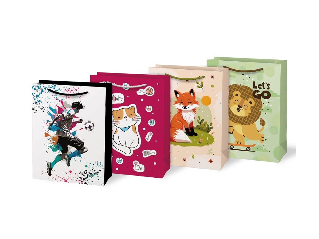 Dárková papírová taška T4 s dětským motivem ve čtyřech různých designech. Je ideální pro předání dárku na oslavě narozenin, vysvědčení nebo jiné významné události. Tato dárková taška zaujme svým vzhledem a zároveň potěší každé dítě. Takto zabalený dárek udělá radost a vytvoří nezapomenutelný zážitek. Pohodlná ucha jsou z pevného materiálu, která zajišťují snadné přenášení.Rozměr: 180mm x 230mm x 100mm (Š x V x H)