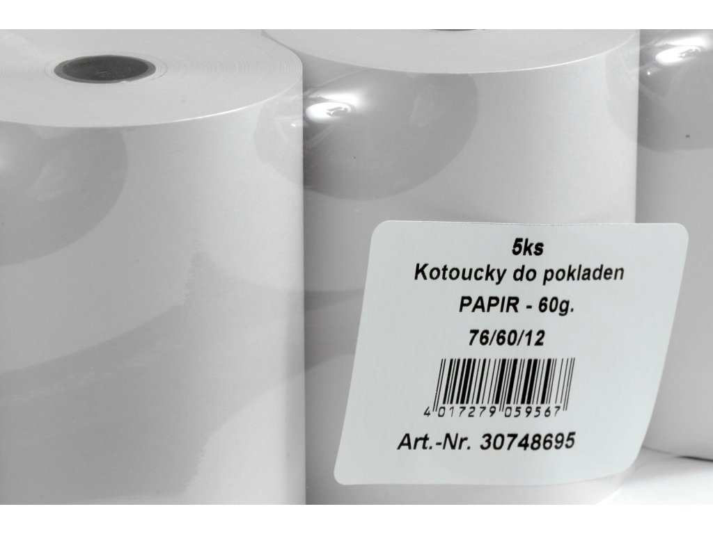 Termo kotouček s typovým označením 76/60/12 má návin 44 metrů a průměr 60 mm při 48 g/m2, dutinka je 12 mm. Je určený pro termotiskárny pokladních účtenek, ale i pro klasické registrační pokladny a pokladní váhy s termotiskem. Kotouček ze zdraví nezávadného recyklovatelného termopapíru bez přítomnosti škodlivé látky Bisphenol A s označením BPA free.Doplňkové parametry