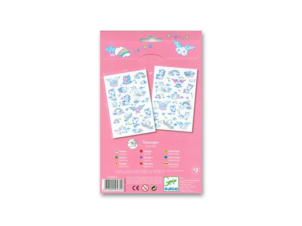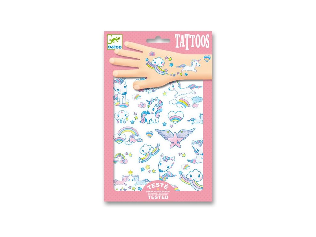 Dětské tetování na kůži s motivem jednorožců, obláčků, duhy a hvězdiček. Balení obsahuje 2 archy. Tetování je dermatologicky testováno a dlouho vydrží.Rozměr balení: 21 cm x 14 cm