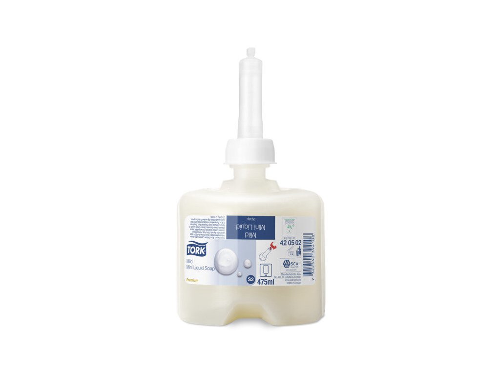 Tork S2 systém jemné tekuté mýdlo krémové barvy se svěží vůní, Premium kvalita, EU Ecolabel certifikace, náplň 475 ml (475 dávek) Premium, 475 ml balení - do Tork zásobníků S2 systém475 dávek v jedné náplni