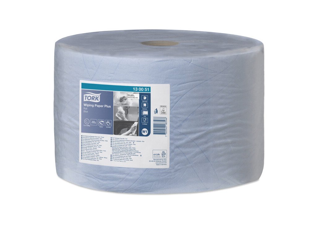 Dvouvrstvá víceúčelová papírová utěrka, modrá, celulóza+ recykl, určená pro středně náročné úkoly spojené s utíráním tekutin a prachu z povrchů, vhodná do zásobníků Tork systému W1 (velké průmyslové role), 510 m návin, 1500 útržkůDoplňkové parametry