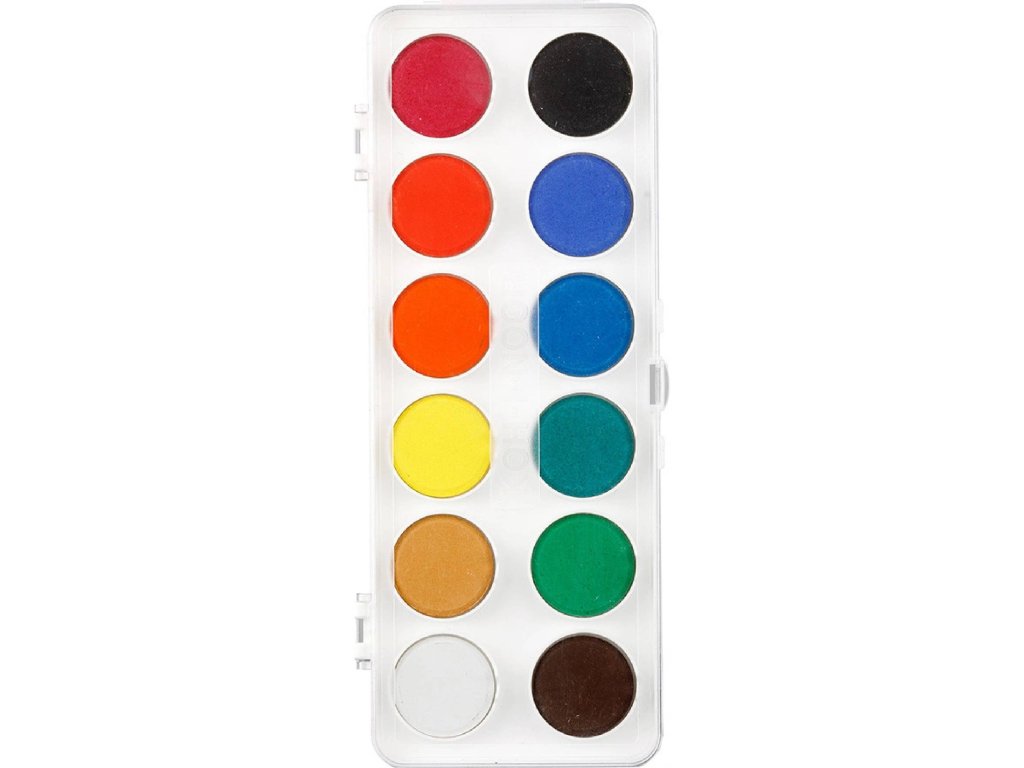 Školní vodové barvy 12ti odstínů s tabletami o průměru 30 mm v obdélníkových, plastových, jednopatrových barevnících s transparentním víčkem. Barvy jsou výrazné, vyznačují se svým vysokým obsahem pigmentů. Jsou certifikované a zcela bezpečné pro děti.Doplňkové parametry