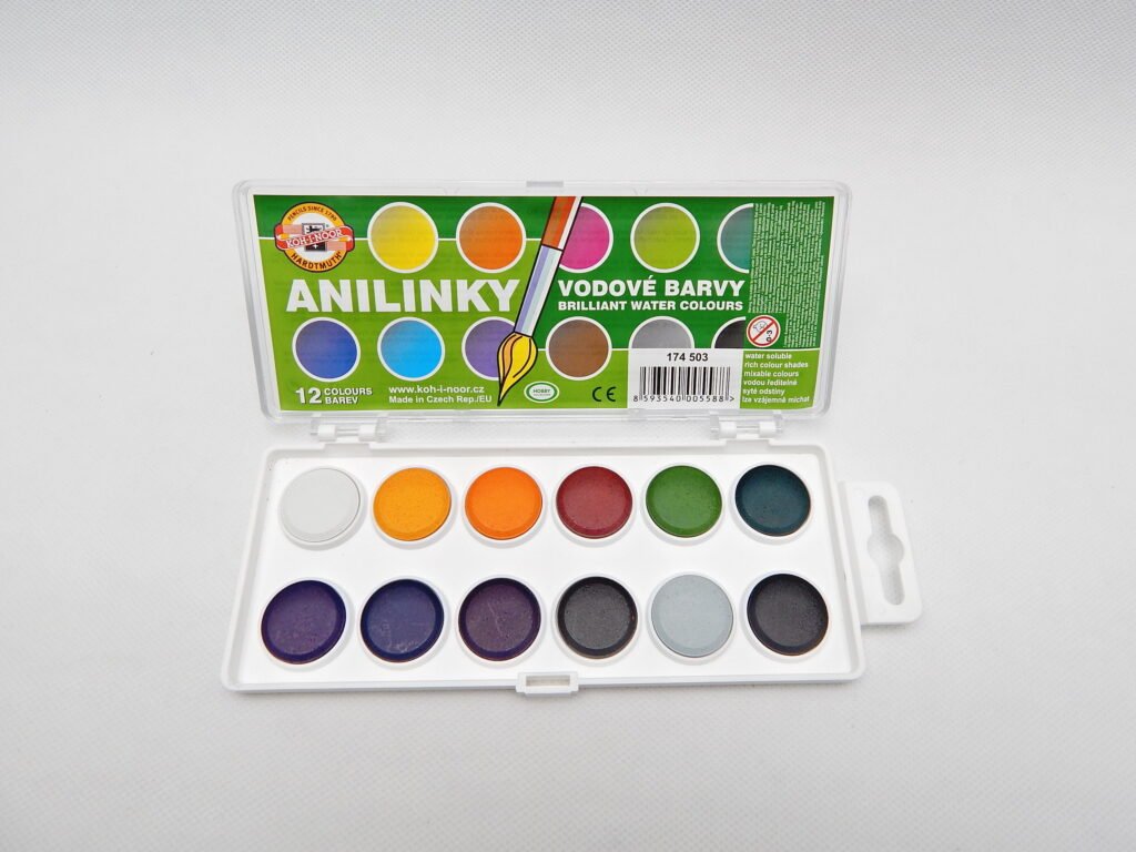 Vodové barvy o průměru tablet 22,5 mm s 12ti brilantními odstíny vhodné pro speciální výtvarné techniky, např. pro kolorování fotografií, malby portrétů, malbě na dekorační předměty, zdobení kraslic aj.. Vložené v plastovém barevníku s transparentním víčkem.Doplňkové parametry