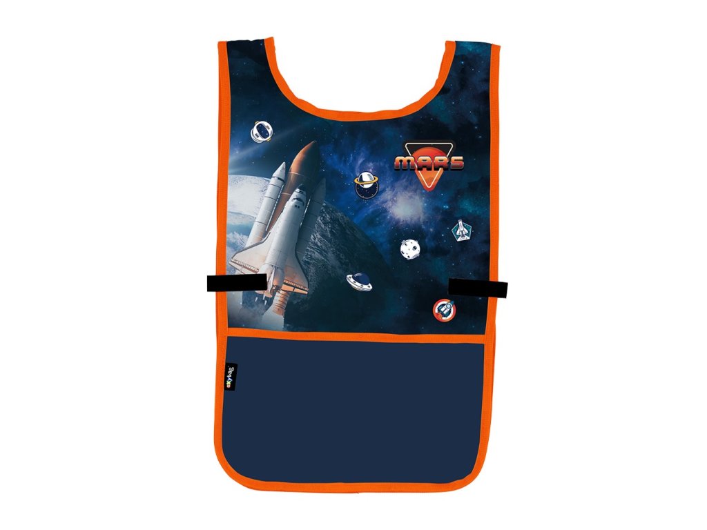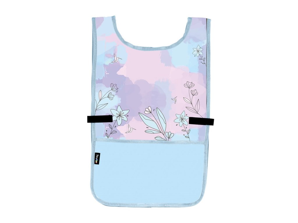 Zástěra pončo do výtvarné výchovy či na jiné tvořící aktivity. Oblékání přes hlavu, po stranách zapínání na druk. Vpředu jedna prostorná kapsa. Materiál 100% polyester.