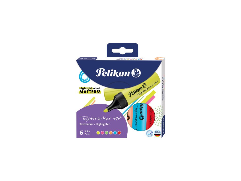 6ks, 6 barev, klínový hrot, šíře stopy 1 + 2 + 5 mm, fluorescenční inkoustové barvy na vodní bázi, odolný proti vysychání, na papír i faxy, v papírové krabičce, na blistru, PelikanDoplňkové parametry